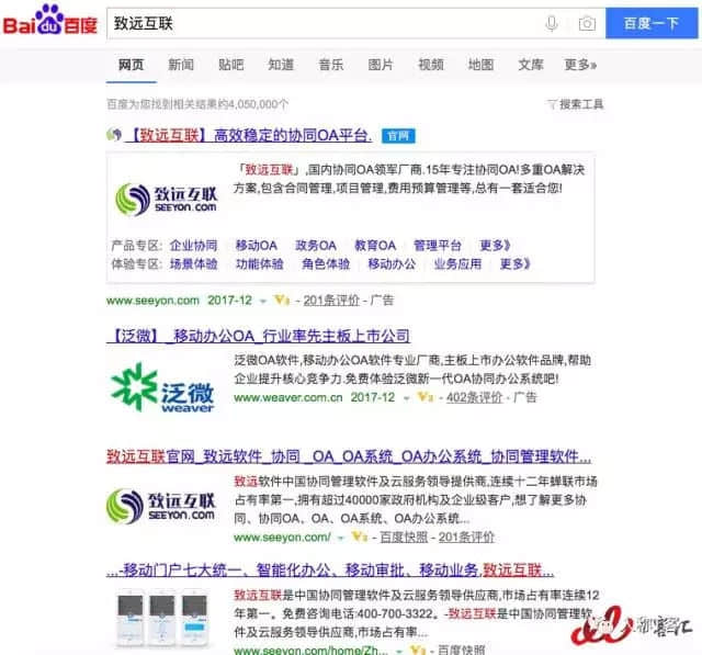 然而T客汇了解到年营收2000万的SaaS创业公司一年花费在百度推广的费用高达200多万,着实是很大的负担,成功不得已拱手给予百度,这也是百度备受诟病之处。而且在百度竞价推广上也存在着不友好的竞争行为,从下图可见一斑。