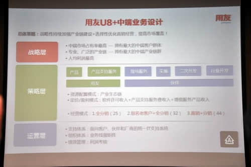 用友分为三大类合作伙伴。徐洋称,去年U8占用友集团业务比重大约40%多,利润贡献超过50%。“因为今年用友U8面临销售模式向分销模式的转型,所以今年的营业额增长计划设定在20%左右,比以往要调低一些。”徐洋如是说。