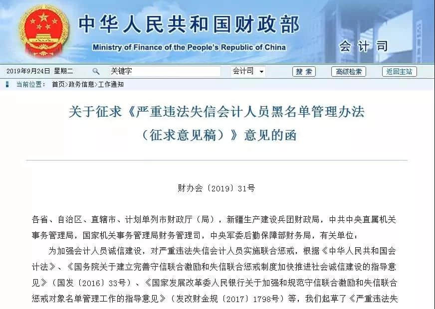 为加强会计人员诚信建设,对严重违法失信会计人员实施联合惩戒,根据《中华人民共和国会计法》、《国务院关于建立完善守信联合激励和失信联合惩戒制度加快推进社会诚信建设的指导意见》(国发〔2016〕33号)、《国家发展改革委人民银行关于加强和规范守信联合激励和失信联合惩戒对象名单管理工作的指导意见》(发改财金规〔2017〕1798号)等,我们起草了《严重违法失信会计人员黑名单管理办法(征求意见稿)》及说明,现印发给你们,请组织征求意见,并于2019年10月20日前将书面意见反馈至我部会计司。同时,欢迎有关方面提出宝贵意见。