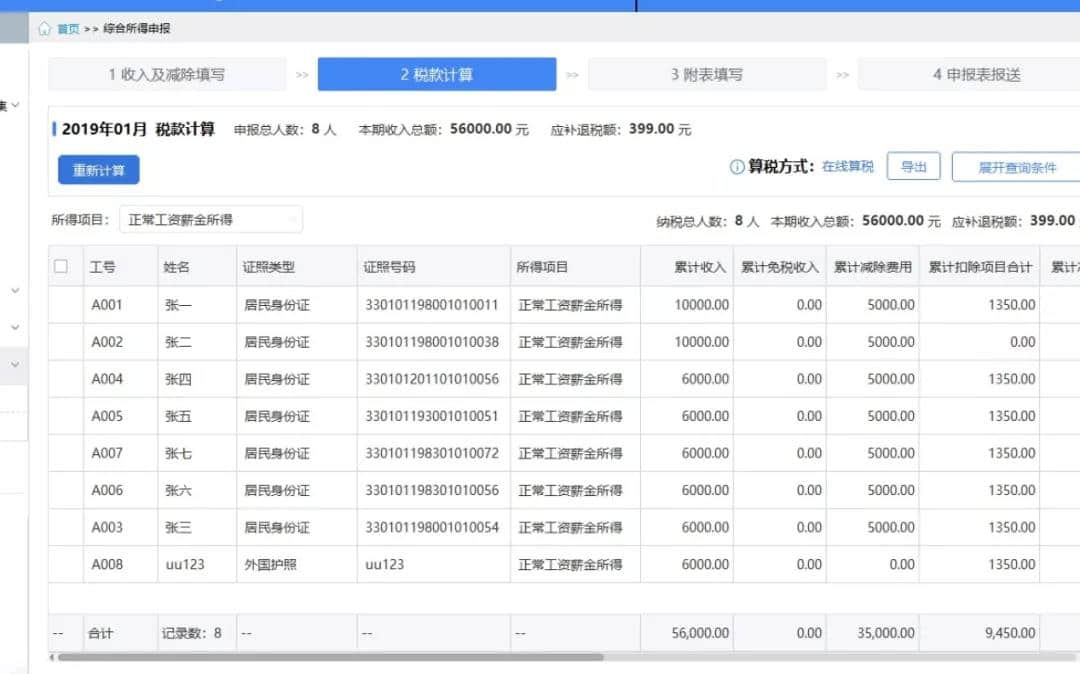 若涉及更正往期申报数据,需对后期月份进行逐月更正。后期数据不存在错误的情况下,可直接进入税款计算中,点击【重新计算】,重算当月累计数据和应补退税额。税款重新计算后,进入发送申报表界面,点击【发送申报】,报送后期月份重新计算的申报结果。