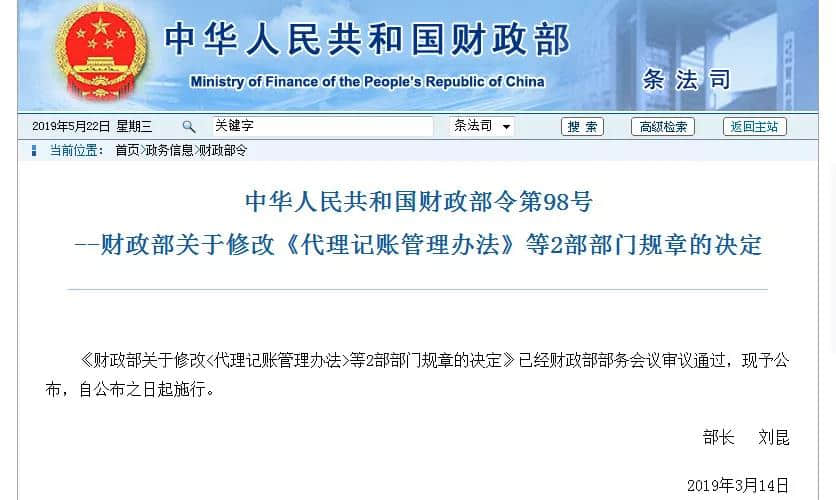 年初,《财政部关于修改<代理记账管理办法>等2部部门规章的决定》已经财政部部务会议审议通过,现予公布,自公布之日起施行。