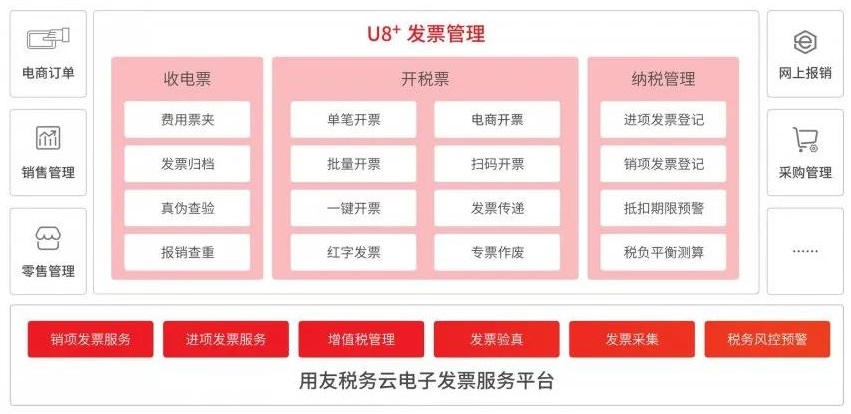 用友U8+V16.0全面支持专票电子化,通过税务云实现电子专票的采集、查验,并进行税务管理。根据企业每个纳税期间开出的销项发票以及可认证抵扣的进项发票进行当期税负平衡测算。