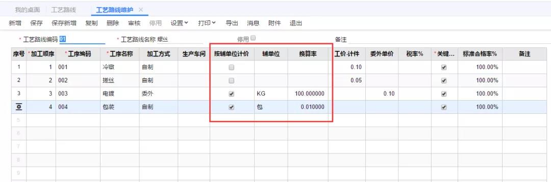 工艺路线:工艺路线增加辅计量。勾选按辅单位计价时,工价、委外价格均为辅计量的价格。